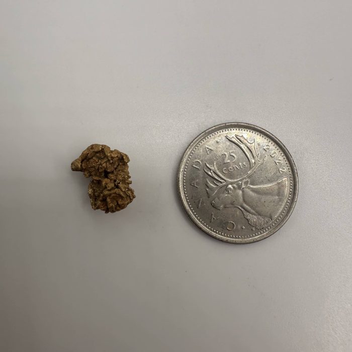 2.88g Raw Natural Canadian Crystalline/Unique Gold Nugget. The characteristics of this gold nugget make it unique and a fantastic addition to any gold nugget collectors collection. Measured against a Canadian Quarter (23.88 mm diameter) for reference of size.