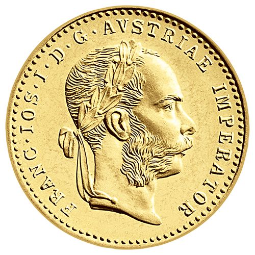 Since the 13th century there have been coins called “ducats” in Europe. From the 16th century onward these were minted in Austria. This coin is a re-minting of the Austrian Mint with the motif of Emperor Franz Joseph I. In 1915 the historical ducat was last minted, hence the year on the back. It also depicts the double-headed eagle of the Habsburg dynasty.